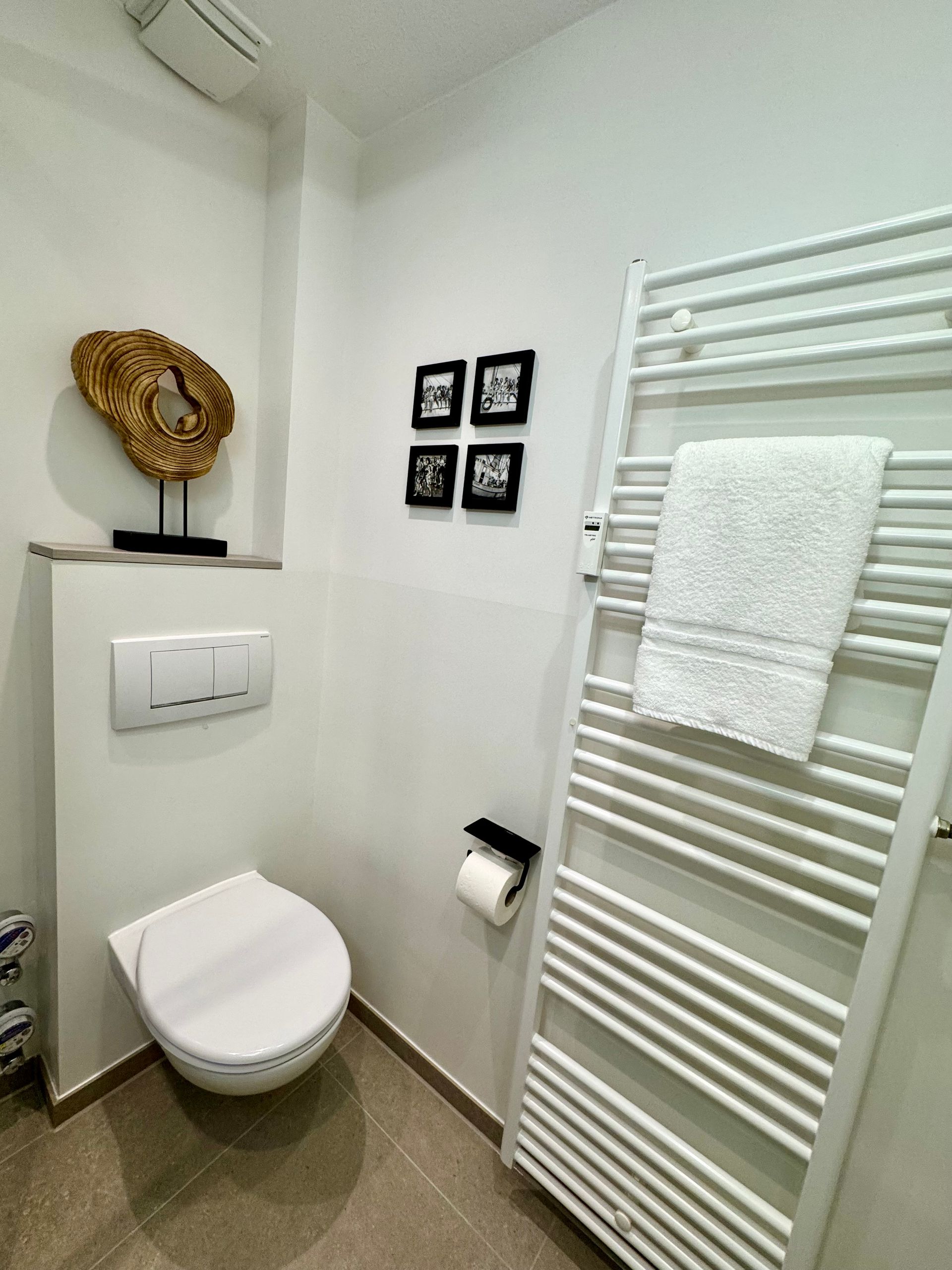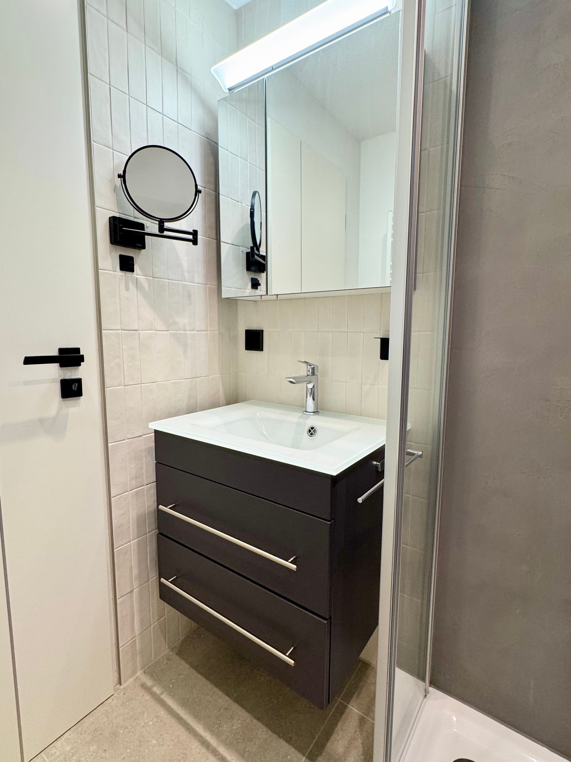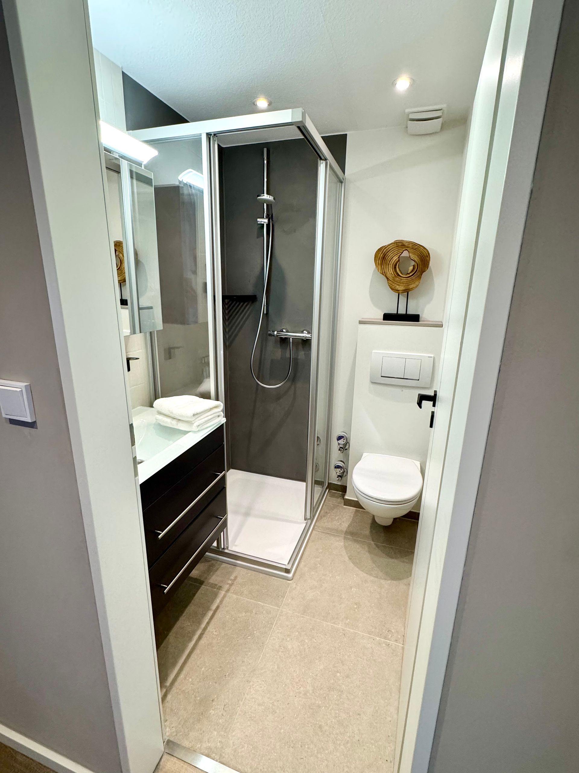 Dusche/WC, Spiegelschrank, Handtuchwärmer, Kosmetikspiegel, Föhn sowie einen bodentiefen Eingang zur Dusche, Fliesenboden
