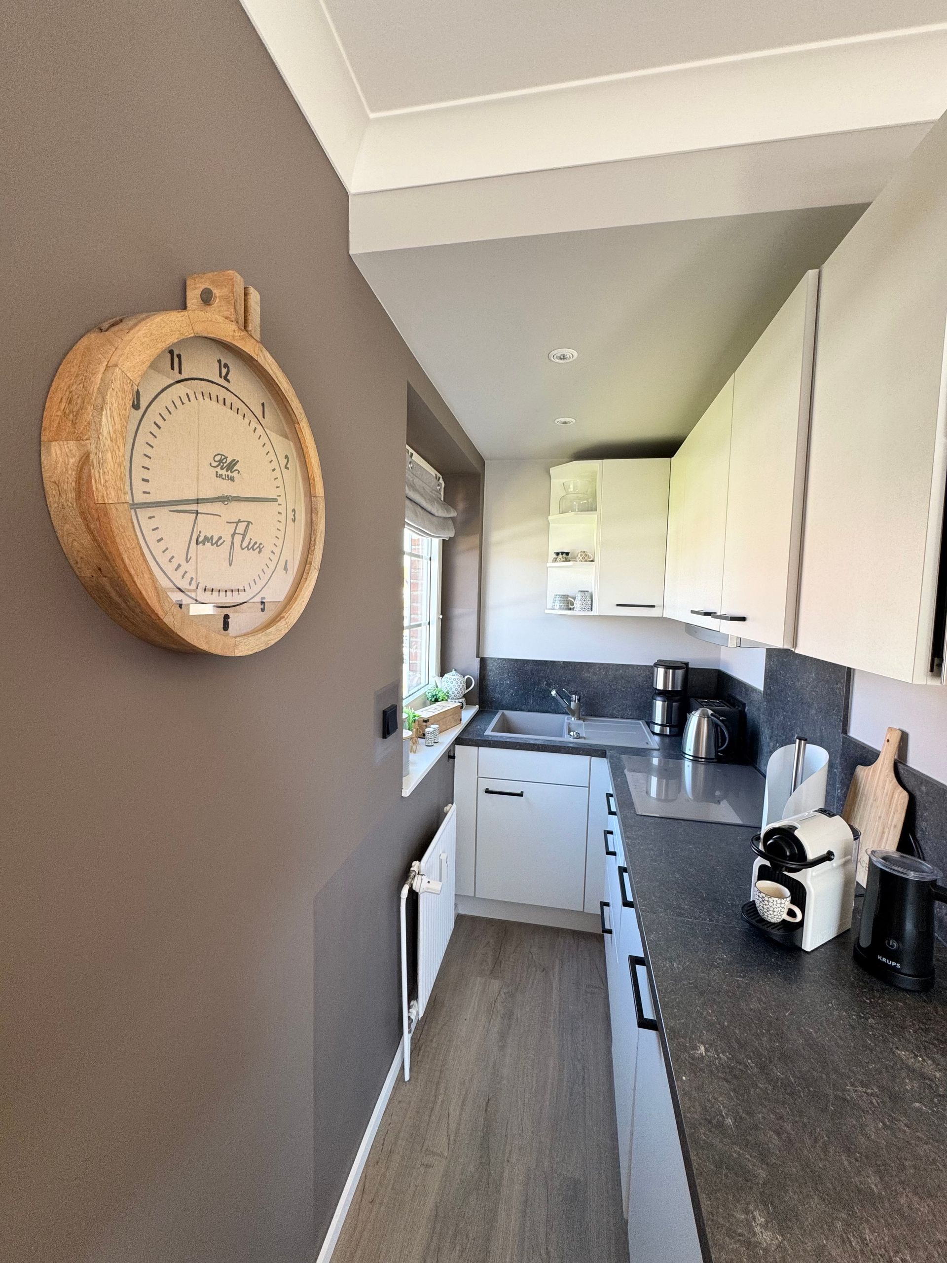 Einbauküche im Wohnraum, Geschirrspüler, Induktionskochfeld, Kühlschrank mit Gefrierfach, Filterkaffeemaschine, Krups Kapselmaschine und Milchaufschäumer (elektrisch), Mikrowelle, Toaster, Wasser- und Eierkocher, ALESSI-Zitruspresse, Stabmixer, genügend Geschirr & Zubehör, Verdunklungsrollo, USB-Steckdose mit Ladevorrichtung für Handy & Co.