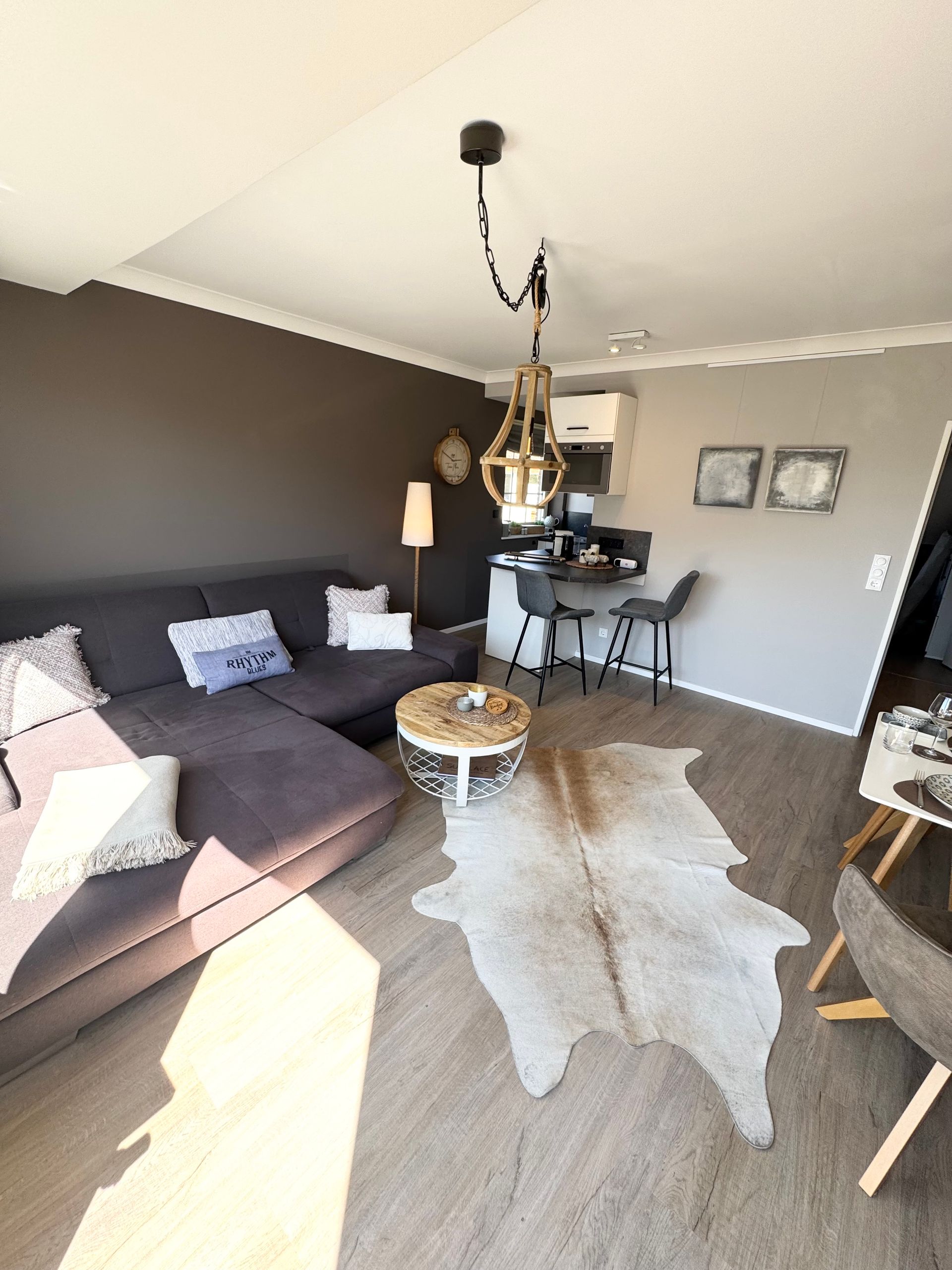 2-er Essplatz am Tresen sowie ein weiterer moderner Platz am Tisch mit 2 gemütlichen Sitzstühlen mit Drehfunktion, Großzügiges Ecksofa mit Recamiere und Schlaffunktion für eine dritte Person von Musterring mit Sitztiefen und Rückenverstellung, Flachbild Smart-TV mit Radioempfang inkl. Netflix- & Co. Zugang (eigenes Konto erforderlich), Verdunklungsvorhänge- und Rollo.